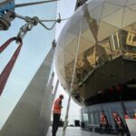 Na Al Faisaliah Tower jsme instalovali světla přímo nad luxusní restaurací v kopuli. Práce ve stísněném prostoru pod zaoblenou konstrukcí vyžadovala přesnost, souhru týmu a důkladné zajištění techniky.